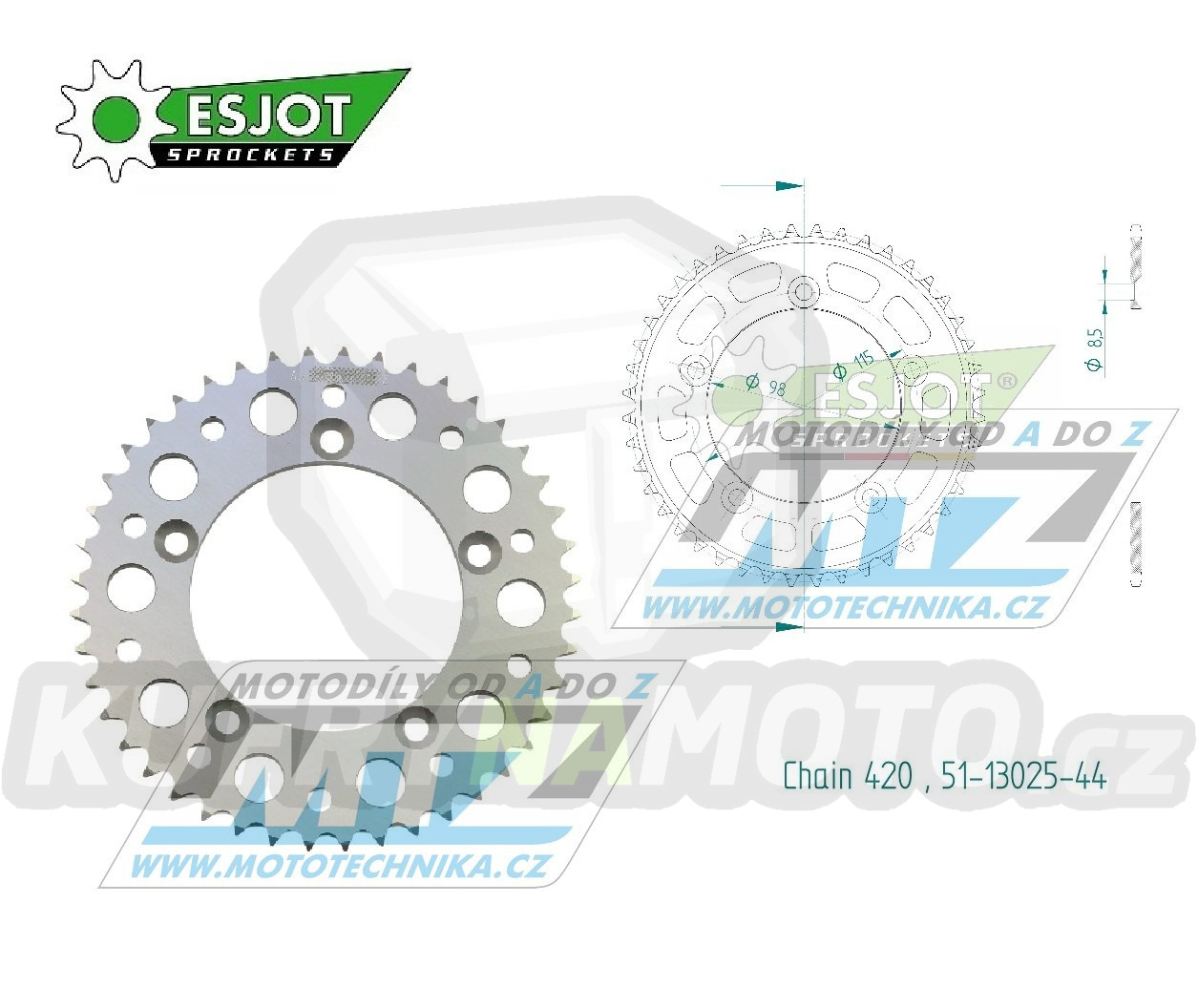 1. Rozeta řetězová (převodník) Dural 0894-44zubů ESJOT 51-13025-44 - barva stříbrná - KTM 65SX / 02-24 + 60SX / 97-01 + Husqvarna TC65 / 17-24 + Gas-Gas MC65